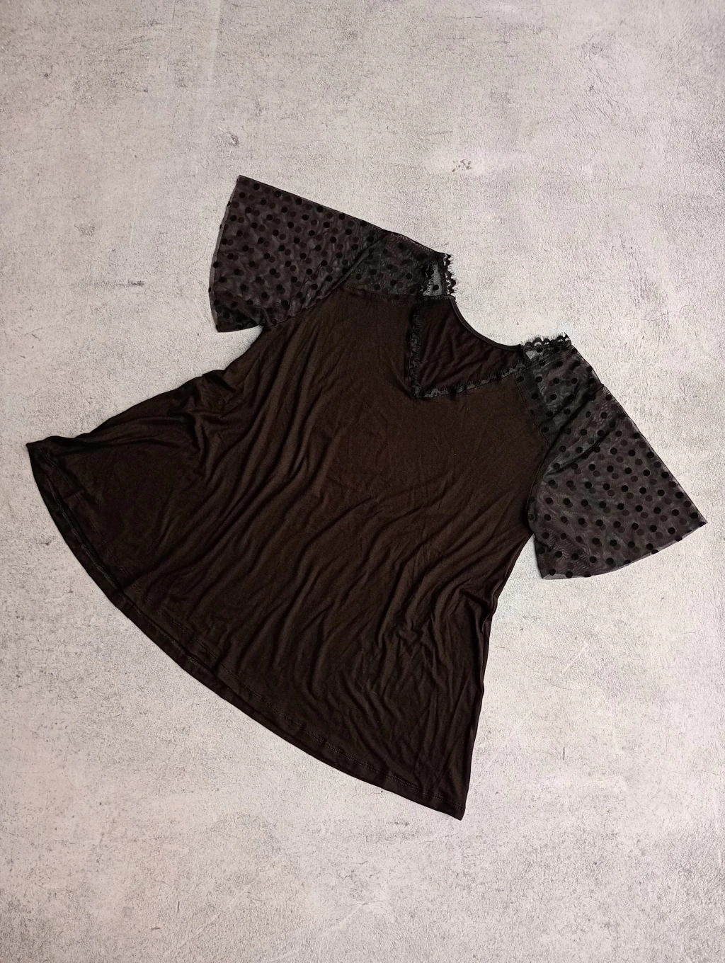 Remera confeccionada en tela de modal con detalles de puntilla y microtul a lunares.